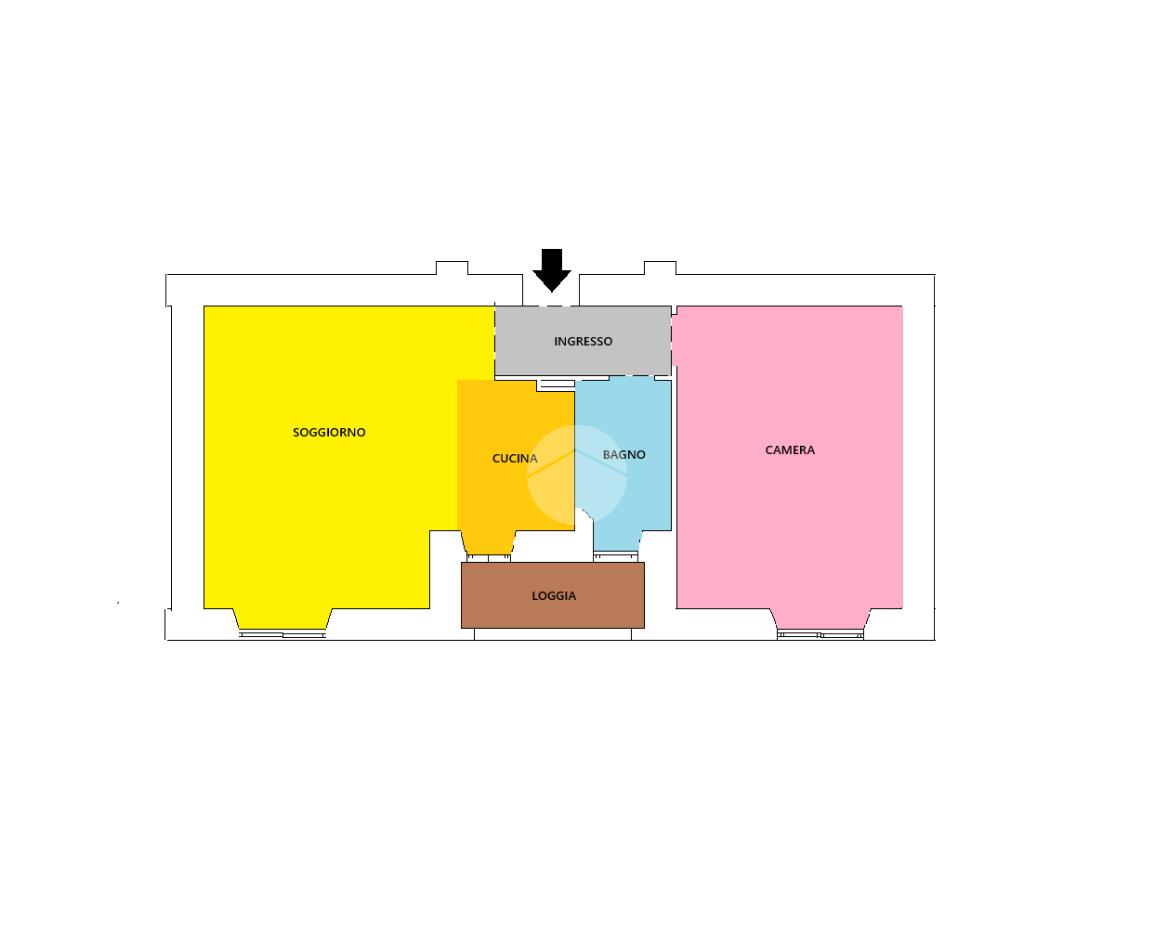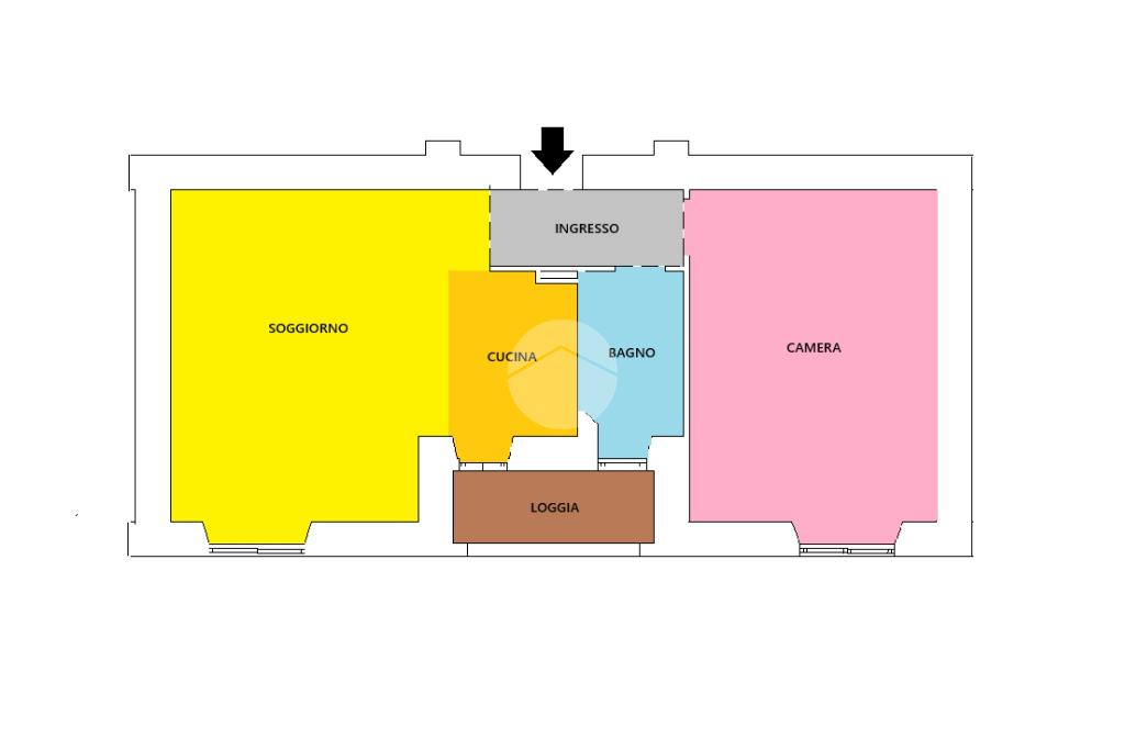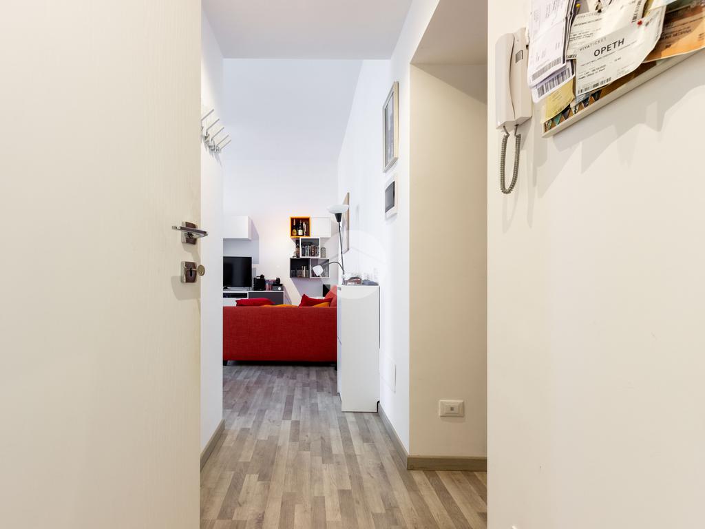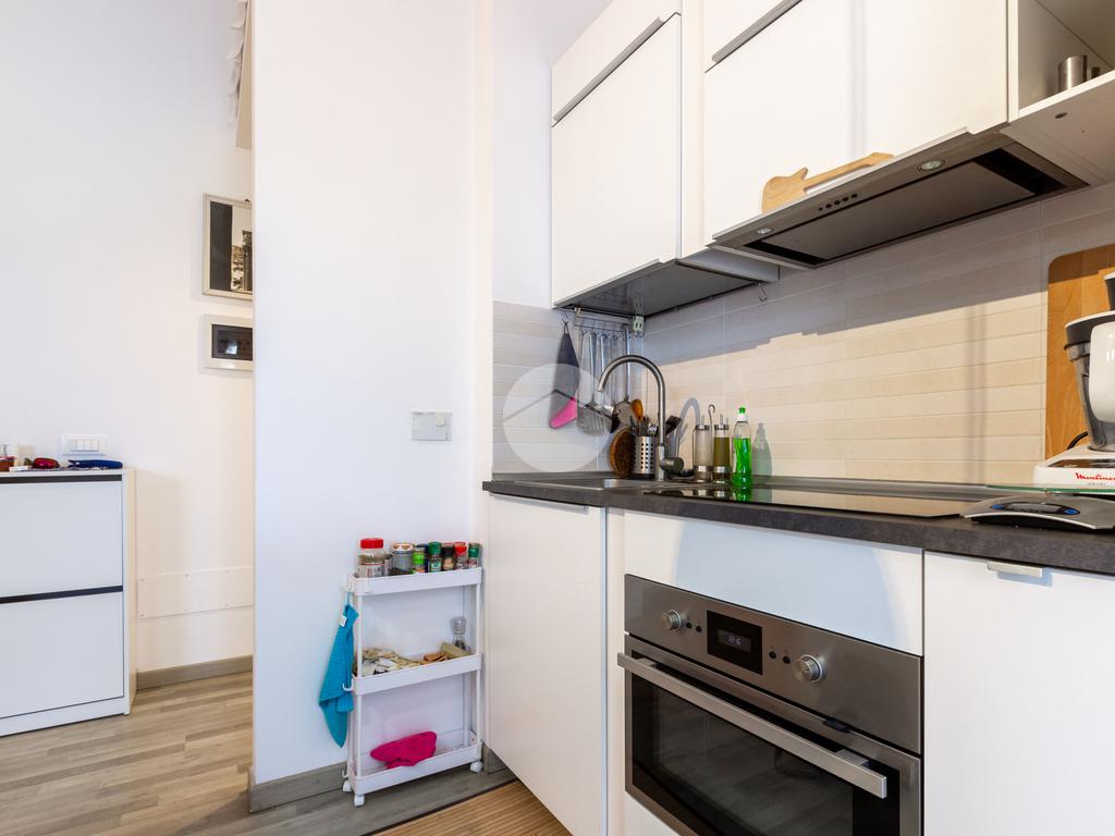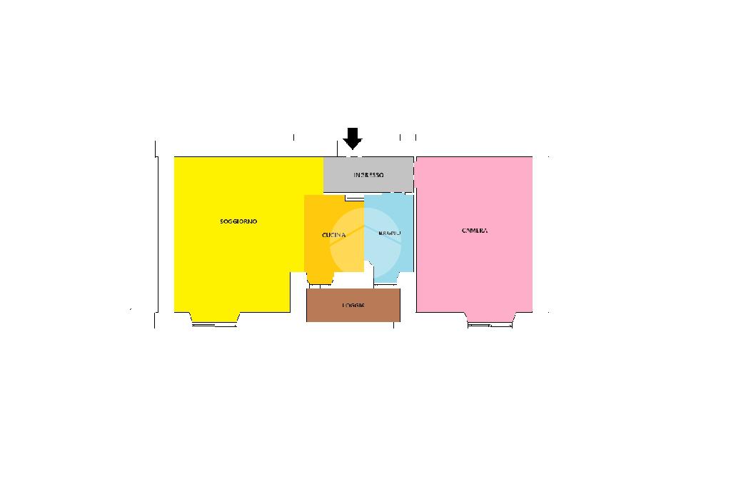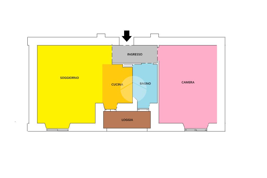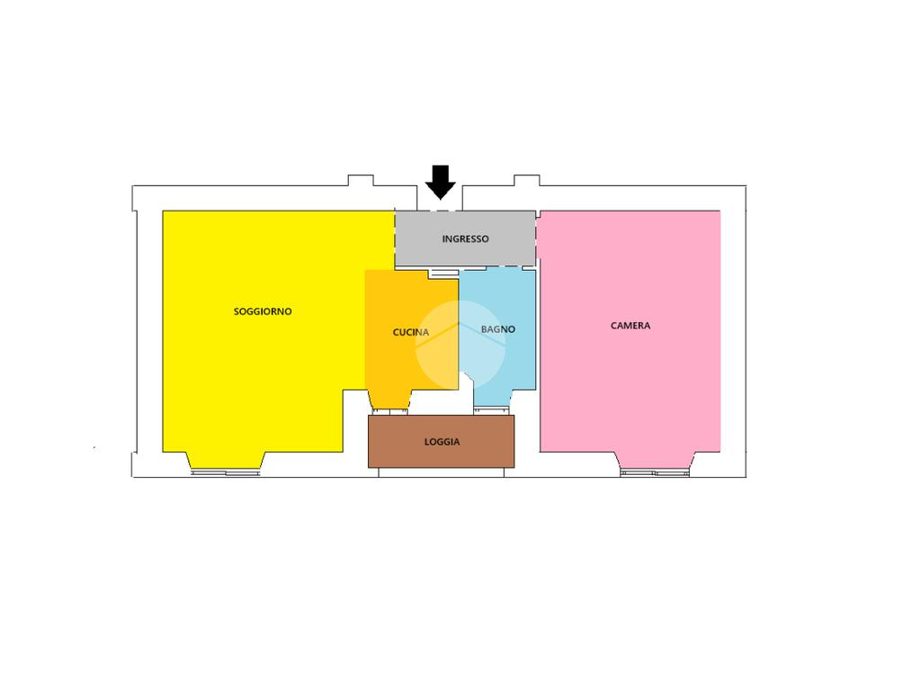 L'immobile è composto da: ingresso, soggiorno con cucina a vista, camera da letto matrimoniale, bagno con box doccia e finestra e un balcone. Internamente si presenta ristrutturato con infissi in doppio vetro e alluminio, riscaldamento centralizzato e condizionatori in camera e soggiorno.