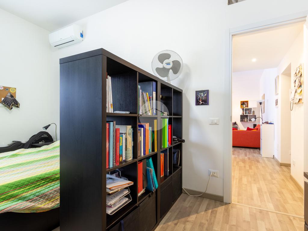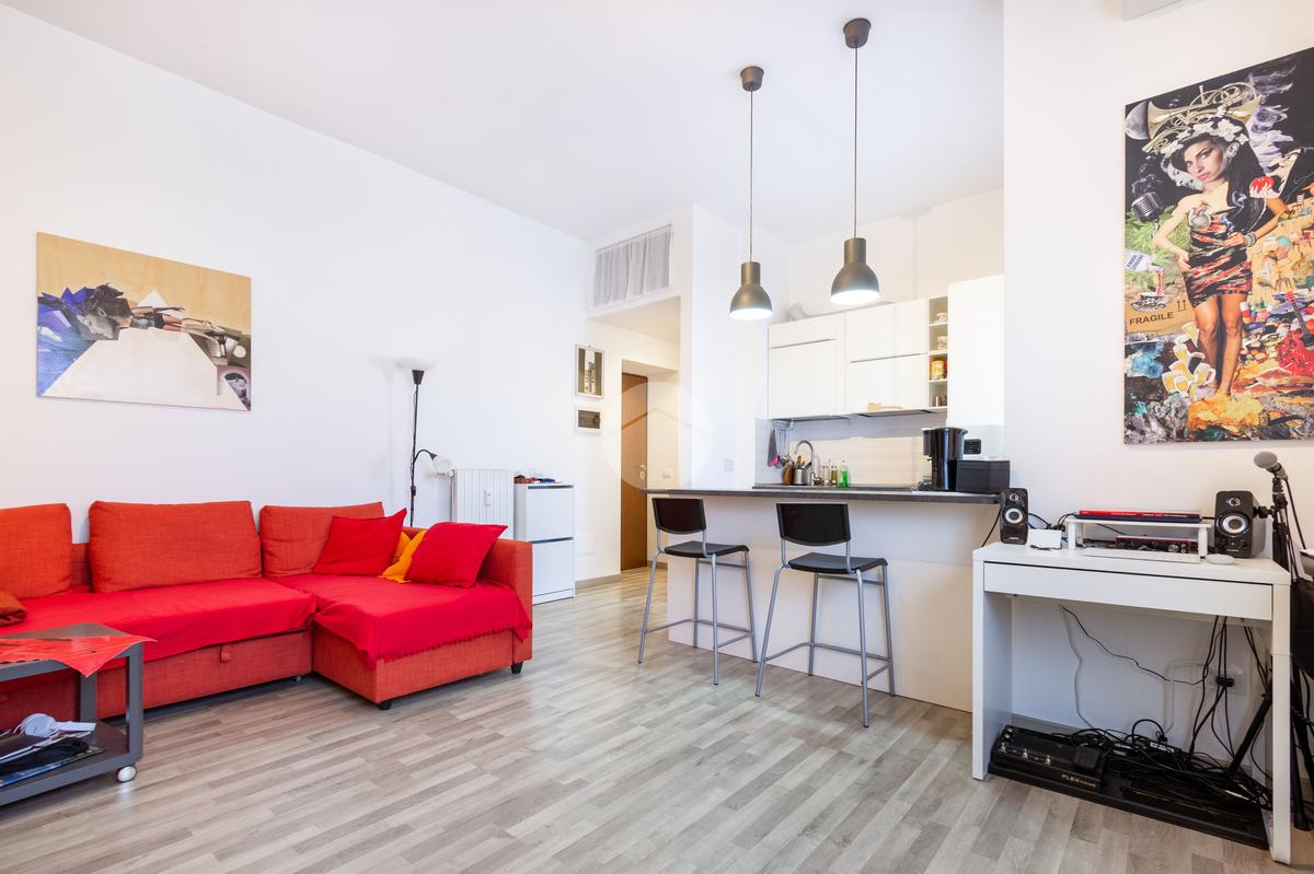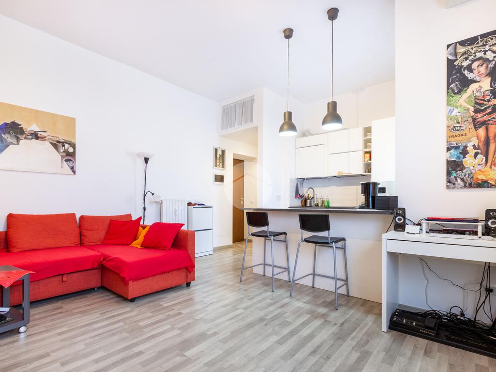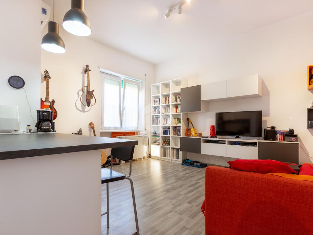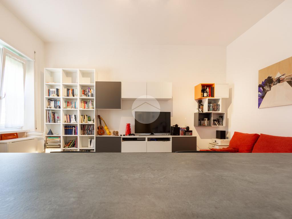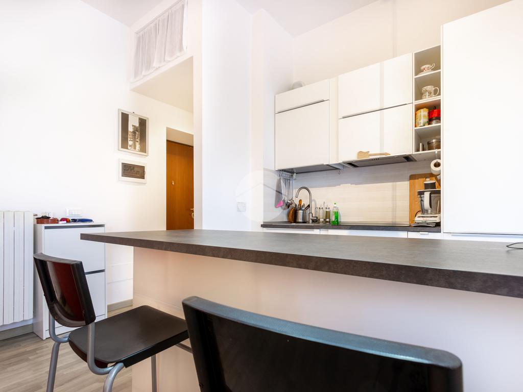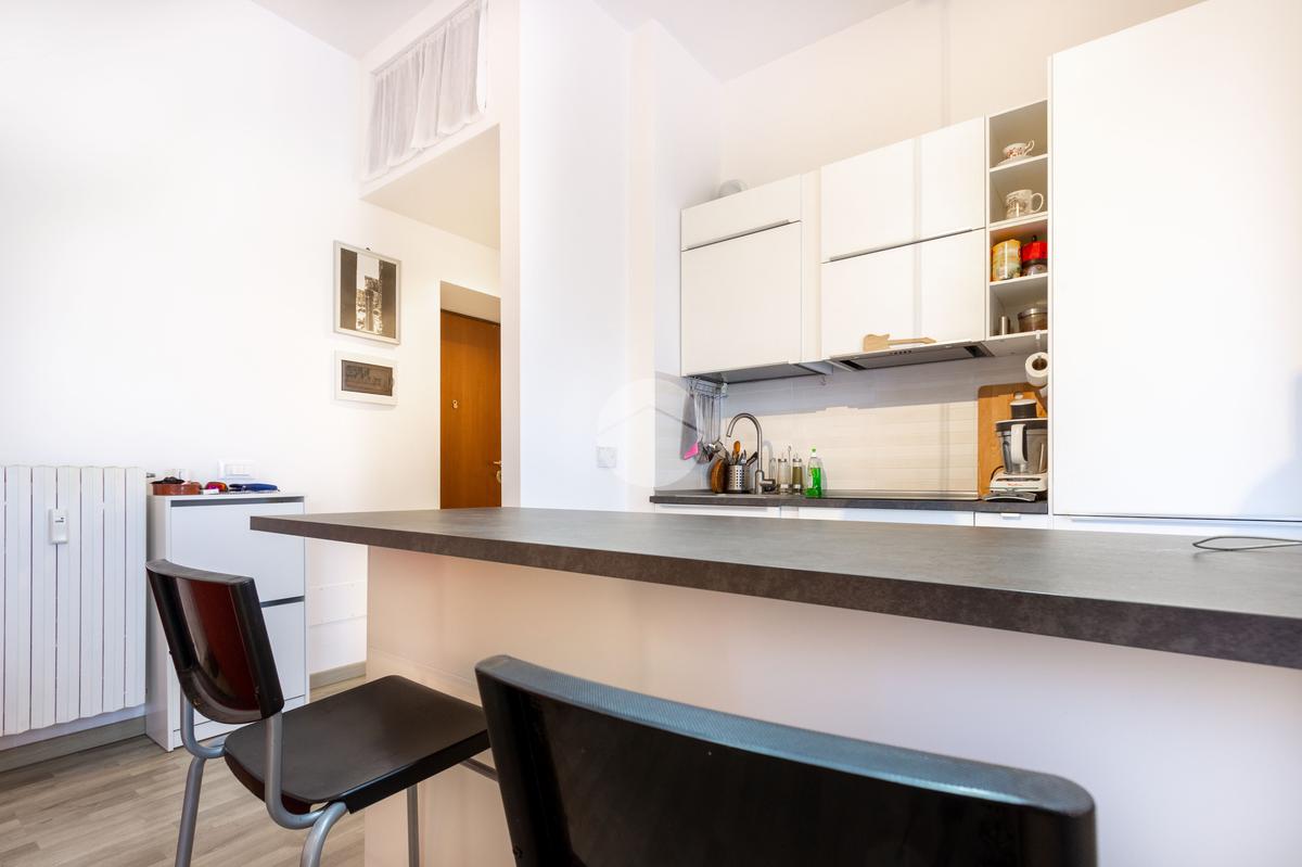 L'immobile è composto da: ingresso, soggiorno con cucina a vista, camera da letto matrimoniale, bagno con box doccia e finestra e un balcone. Internamente si presenta ristrutturato con infissi in doppio vetro e alluminio, riscaldamento centralizzato e condizionatori in camera e soggiorno.
