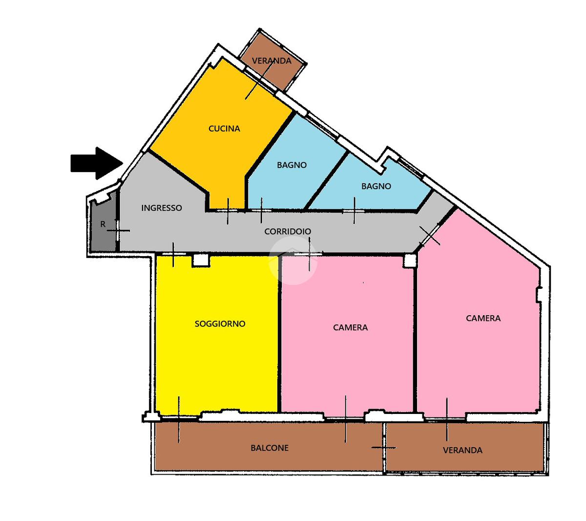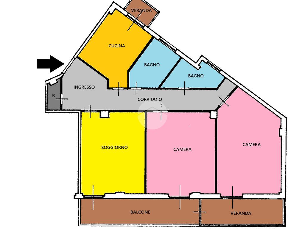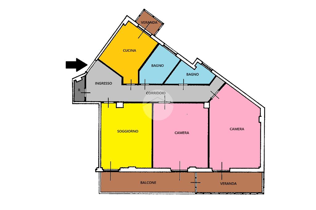 L'immobile è così composto: ampio ingresso, soggiorno, cucina abitabile, due camere da letto matrimoniali, doppi servizi con finestra, ripostiglio, balcone e due verande.