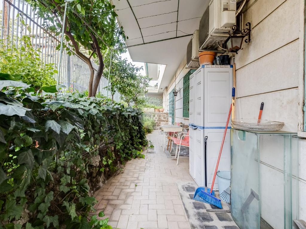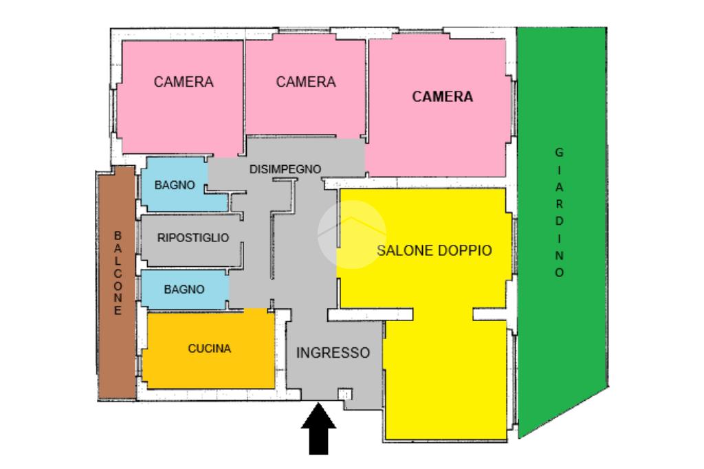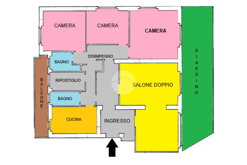 ingresso, salone doppio, cucina, tre ampie camere da letto, doppi servizi, ripostiglio, balcone e giardino pavimentato.